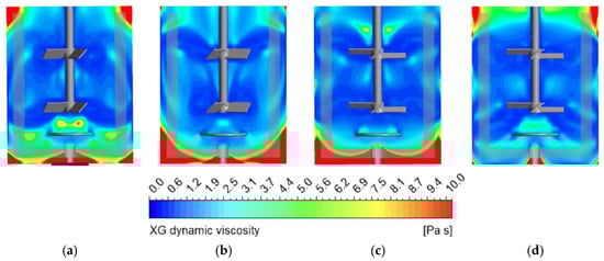 Local viscosity distribution for different mixing configurations: (a) Down-Co, (b) Up-Co, (c) Down-Counter, and (d) Up-Counter at Nc = 350 rpm, Na = 10 rpm, and Qg = 20 L/min.