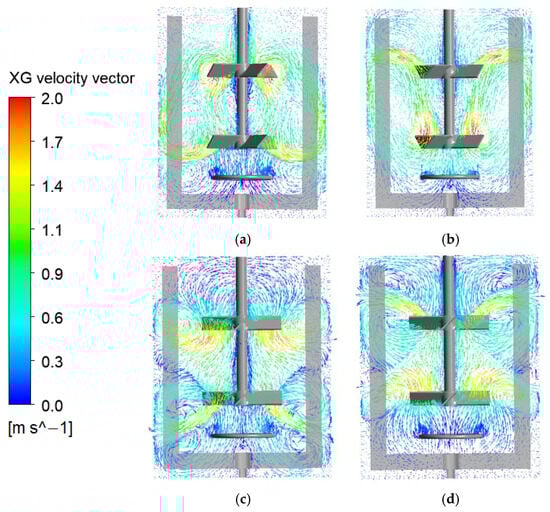 The velocity fields were analyzed to conduct a more in-depth analysis of how mixing configurations affect shear rate distribution. Consequently, the velocity vectors were created for the 1 wt% xanthan gum solution over an axial plane for all configurations, including the Down-Co, Up-Co, Down-Counter, and Up-Counter, operating at Nc = 350 rpm, Na = 10 rpm, and Qg = 20 L/min, using CFD post-processing as shown in Figure 8. According to this figure, the high-speed red vectors represent the jets discharged from the central impellers, while the low-speed blue vectors indicate areas of slow motion. In a conventional double-mixing bioreactor without a close-clearance impeller, the radial jets discharged from the impeller move both upward and downward, forming upper and lower loops around each central impeller. Notably, Jamshidzadeh et al. [42] demonstrated that in a coaxial mixing system equipped with a close-clearance anchor and two central impellers, the synergistic effect of the anchor and central impellers led to the merging of the upper and lower loops, resulting in stable axial circulation loops in the middle of the tank, as shown in Figure 8a,b. When comparing the upward and downward pumping in the co-rotating mode, it became evident that while in the Down-Co configuration, the lower loops generated by the bottom impeller existed, the upper loops formed by the top impeller disappeared. This led to a significant reduction in the magnitude of the velocity vectors, resulting in decreased fluid motion near the anchor blades at the top part of the tank and a subsequent reduction in shear distribution in these areas. However, in the Up-Co mode, the upper loops generated by the top impeller ensured efficient mixing near the anchor blades at the top part of the tank.