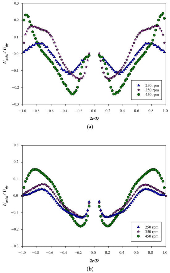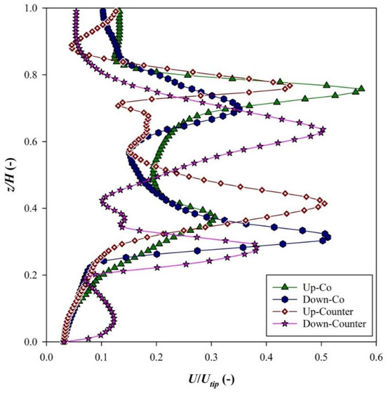 As reported in the literature, the transition in the axial velocity from positive to negative affirms the existence of circulation loops [5]. Additionally, the values of both negative and positive peaks of the normalized axial velocity increased with a further increase in the central impeller speed, demonstrating the development of stronger circulation loops, which is in line with the findings in Figure 8. It is noteworthy that higher values of the axial liquid velocity were obtained in the Up-Co mode compared to the Up-Counter mode, once again indicating enhanced flow hydrodynamics in the Up-Co mode.