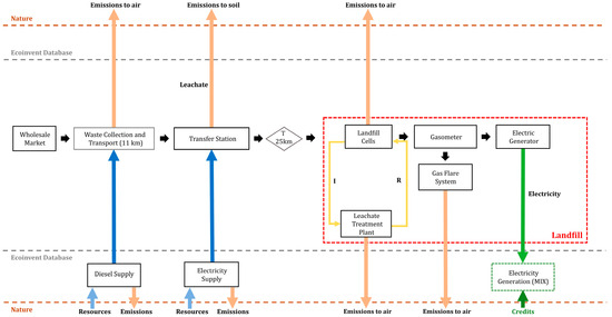 FVW is generated in considerable quantities within these centralized markets, thus providing a valuable opportunity for the implementation of more efficient and sustainable management technologies [6]. Anaerobic digestion (AD) is one of the safest alternatives to FVW management from an environmental perspective [1]. AD allows the on-site efficient production, capture, and use of biogas from the microbial degradation of organic matter. This sustainable process significantly reduces greenhouse gas emissions and unpleasant odor emissions, simultaneously enabling the recovery of valuable nutrients and other materials for soil amendments [12,13]. AD is a suitable technical alternative to landfill disposal for improving the treatment and management of FVW in these centralized markets. However, despite AD having been widely evaluated from an operational point of view, the environmental impacts of its implementation for FVW treatment options in Mediterranean wholesale markets as an alternative to landfilling has not yet been comprehensively studied. For that, a life cycle assessment (LCA) is necessary to quantify these specific impacts. LCA is a methodological framework used to estimate and evaluate the environmental impacts associated with the life cycle of a product, process, or service [14]. LCA has been previously applied for the evaluation of different waste treatment technologies in municipal solid waste management [15,16,17,18,19], but, to our best knowledge, there is no reported LCA in a fruit and vegetable wholesale market context. LCA could therefore be used to assess and compare the environmental impacts of the two different FVW treatment options.