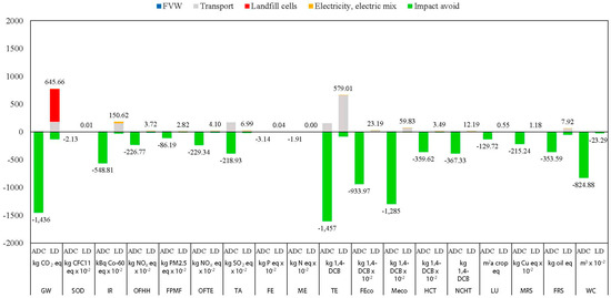 Figure 3 shows the environmental impacts associated with each category when the system expansion approach is applied. The results indicate that the proposed ADC scenario is the best option for all 18 impact categories considered. This is explained due to the higher amount of biogas generated by the FVW biodegradation with respect to the gas generated in the landfilling, which leads to a higher electric energy production, specifically 413%. Moreover, the two organic biofertilizer streams generated in the ADC scenario (Figure 2) would avoid the production of 100 kg/d of inorganic fertilizers such as ammonium nitrate (Table 2). The proposed ADC scenario is the best option with negative net values for these five categories: −1436.08 kg CO2 eq. (global warming), −1456.94 kg 1,4-DCB (terrestrial ecotoxicity), −367.33 kg 1,4-DCB (non-carcinogenic human toxicity), −129.72 m2a crop eq. (land use), and −353.59 kg oil eq. (fossil resource scarcity) (Figure 3). Electrical energy is the main source of credits for the fossil resource scarcity category (69%) in the proposed scenario, while liquid biofertilizer and compost production are the main sources for the global warming (57%), terrestrial ecotoxicity (76%), non-carcinogenic human toxicity (97%), and land use (99%) categories (Figure 4 and see Supplementary Material Table S2).