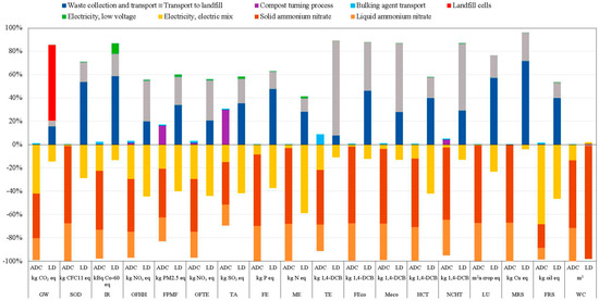 Percentage contribution to the impacts for the landfill disposal (LD) and the AD coupling with a subsequent composting process (ADC). (GW: global warming (kg CO2 eq.); SOD: stratospheric ozone depletion (kg CFC11 eq.); IR: ionizing radiation (kBq Co-60 eq.); OFHH: ozone formation, human health (kg NOx eq.); FPMF: fine particulate matter formation (kg PM2.5 eq.); OFTE: ozone formation, terrestrial ecosystems (kg NOx eq.); TA: terrestrial acidification (kg SO2 eq.); FE: freshwater eutrophication (kg P eq.); ME: marine eutrophication (kg N eq.); TE: terrestrial ecotoxicity (kg 1,4-DCB); FEco: freshwater ecotoxicity (kg 1,4-DCB); Meco: marine ecotoxicity (kg 1,4-DCB); HCT: human carcinogenic toxicity (kg 1,4-DCB); NCHT: non-carcinogenic human toxicity (kg 1,4-DCB); LU: land use (m2a crop eq.); MRS: mineral resource scarcity (kg Cu eq.); FRS: fossil resource scarcity (kg oil eq.); WC: water consumption (m3)).
