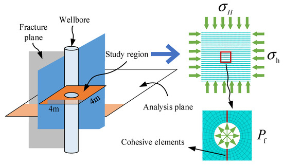 The simulation analysis shown in Figure 3 used 2436 cpe4p units for formation and 88 coh2d4p units for cracks. Displacement constraints, impermeable boundaries, horizontal maximum and minimum principal stresses, and pulsed cyclic water pressure were applied to the shot hole eye section of the specimen.