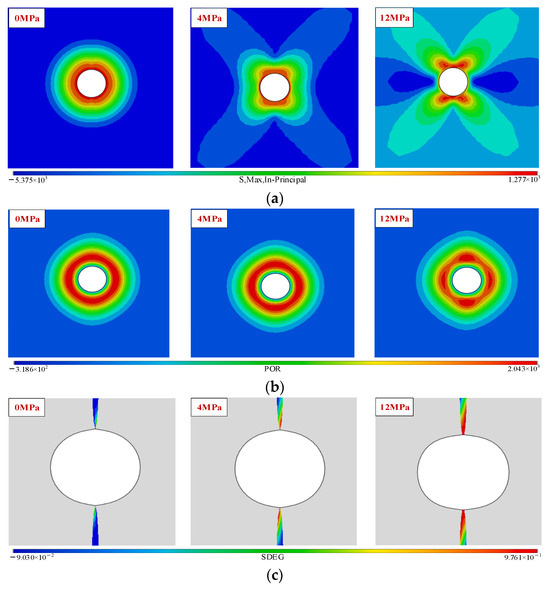 Variation rule around borehole under different ground stresses: (a) The maximum principal stress in the plane. (b) Pore pressure. (c) Damage.