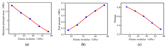 Variation rule around the borehole under a different modulus of elasticities: Modulus of elasticity. (a) The maximum principal stress in the plane. (b) Pore pressure. (c) Damage.