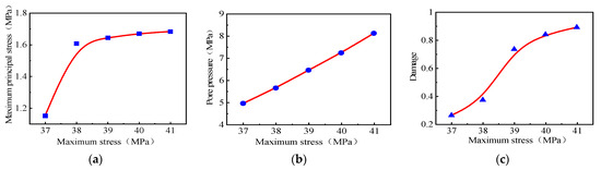 Compared and contrasted were the two groups, A and E, thus studying the effect of Maximum stress on pulsed hydraulic fracturing. The maximum principal stress cloud, pore pressure cloud, damage cloud, and influence law curves of the plane at a 1 Hz pulse frequency and 37 MPa–41 MPa maximum stress are shown in Figure 10 and Figure 11. At higher maximum stress, the principal stress in the eyelet plane, range of action, damage, and pore pressure around the eyelet gradually increased. This increased the pressure and reduced the pore space, leading to higher pore pressure. The dynamic response remained constant due to load action, with little effect on diffusion.