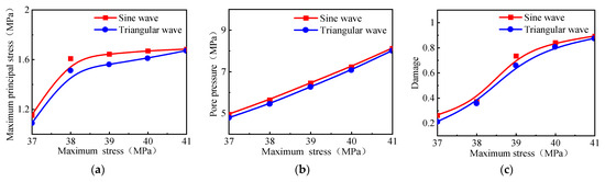 Figure 21 shows the relationship between the number of cycles and cumulative damage at different maximum stresses. The cumulative damage increased with the number of cycles, while the single-damage variable decreased. Lower maximum stress resulted in a small starting single-damage variable, while higher stress increased the cumulative damage variable faster. Fewer cycles were required for the cumulative damage to reach 1 due to the higher principal stress and pore pressure at the same impulse load and stratigraphic conditions.
