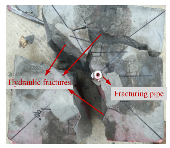 The experiment was conducted using conventional hydraulic fracturing technology. The injection pressure curves and fracture morphology are shown in Figure 23. The specimen was fractured at a starting pressure of 20 MPa, which eventually produced only one horizontal fracture. The specimen was dissected, presenting a crack in the horizontal direction.