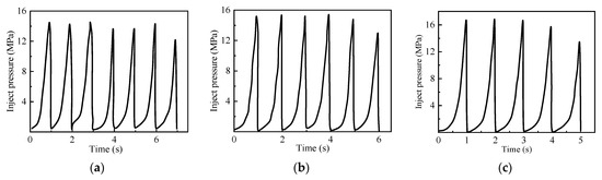 The injection pressure curves for the different pulse amplitudes: (a) 15 MPa. (b) 16 MPa. (c) 17 MPa.