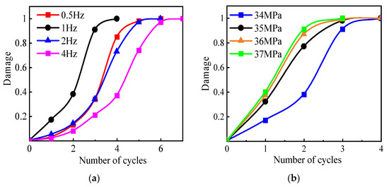 Figure 28a displays the damage curves versus the cycle number at different frequencies, with the number of cycles required for the damage to reach 1 varying depending on the pulse frequency. At 1 Hz, the model showed the least cycles required, at 4, compared to other frequencies. As shown in Figure 28b, the minimum damage amplitude of the model under impulse cycling was 34 MPa. The number of cycles required for the damage to reach 1 varied with the impulse amplitude, which decreased as the pulse amplitude increased. The amplitude was reduced by 24.4% compared to the static 45 MPa.
