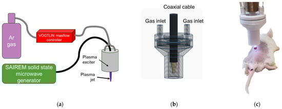 The experimental configuration employed for this study is depicted schematically in Figure 1a. The CAP jet was generated through a plasma exciter coupled to a solid-state microwave generator (model GMS 200 W by SAIREM–FRANCE, Décines-Charpieu, France) operating at 2.45 GHz. The input wave power ranged from 5 to 20 W, with a reflected power consistently below 1 W. The exciter, illustrated in Figure 1b, featured a metal antenna positioned at the axis of the discharger and Figure 1c presented the treatment. The plasma was sustained around the antenna within an argon gas medium, supplied through two axial inputs parallel to the antenna. Treatment was performed with the tip of the plasma jet. A typical jet’s length is between 10 and 15 mm, and the length is strongly dependent on the applied microwave power and gas flow speed. The diameter of the jet did not exceed 3 mm, while the nozzle’s diameter was 5 mm.