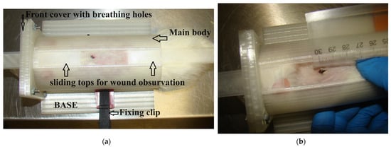 The 3D-printed restrainer for determining wound closure (a) and measurement of wound area (b).