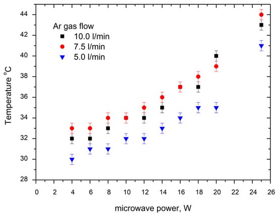 Experimental results about the treated area’s temperature on mica plate at various treatment conditions for microwave power and gas flow.