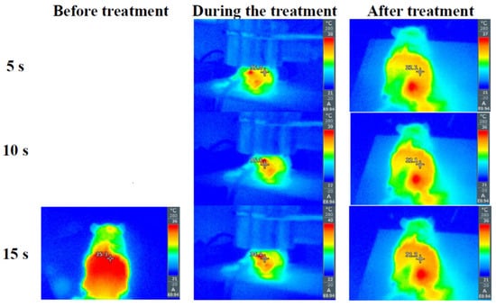 Determination of the treated area’s temperature and monitoring it during the in vivo treatments was performed with a Testo 865 infrared camera (produced by Testo SE & Co. KGaA, Titisee-Neustadt, Germany) as investigated in []. We measured the reflected radiation from a tilted 45-degree mica plate. Mica does not absorb infrared radiation, which is essential for thermography. The chemically inert nature of the mica plate does not lead to the interaction of the plate with the plasma and electromagnetic field. Mica has excellent thermal insulation properties. It can withstand high temperatures and acts as a barrier against heat transfer. This makes it valuable in applications where accurate temperature measurements are critical.