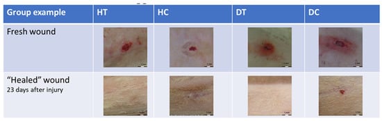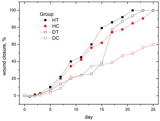 We see two-day differences in keratin layer separation for the HT group (on day 14) compared to the HC group (on day 16). Since then, area reduction for both groups has been parallel, but the HT group achieved total wound closure on the 21st day, while the control group achieved total wound closure on the 25th day.