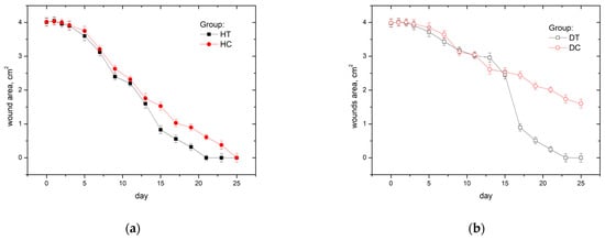 Average wound area in time for healthy (a) and diabetic (b) groups.