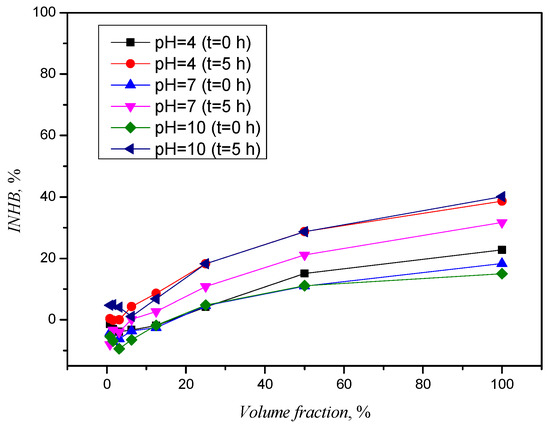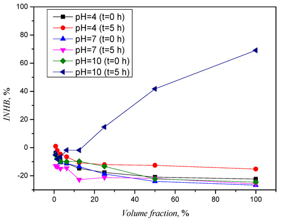 Thiacloprid was found to be resistant to photodegradation and biodegradation and the concentration of TIA remained unchanged under sunlight [23]. The Food and Agriculture Organization (FAO) and the European Commission reported a t1/2 of TIA of 80 days under simulated sunlight and 324 days under natural sunlight in Phoenix [24]. Figure 7 shows the toxicity curves of the TIA samples before and after photolysis. The measurement of the samples before photolysis showed that the samples are toxic at a pH value of 7 in all dilutions, while they are toxic in 80 to 100% of the samples at pH values of 4 and 10. However, the degree of induced inhibition is not significant. The samples after photolysis showed no significant inhibition deviations (increase/decrease in the range of 6 to 10%).