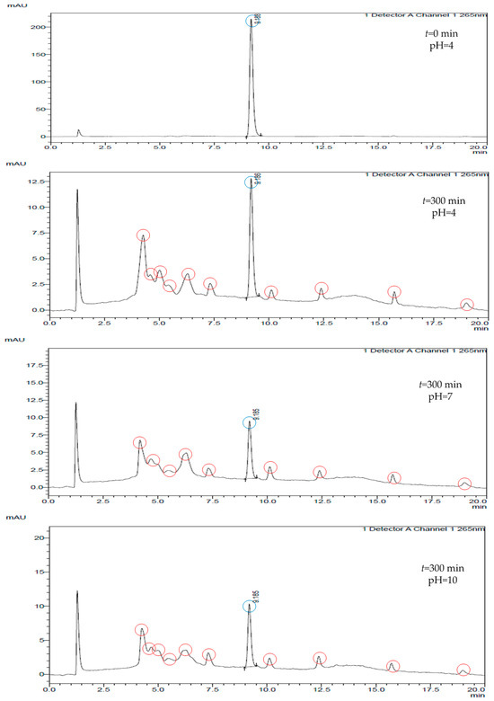 At each pH value, a series of new chromatographic curves were observed between retention times of 4 and 9 min and between 9 and 20 min. This is an indication of the possible newly formed degradation and/or transformation products of CLO. As part of their research, Li et al. [35] investigated the photolytic degradation of CLO in soil, and new degradation and/or transformation products were observed, with a decrease in the concentration of the parent compound.