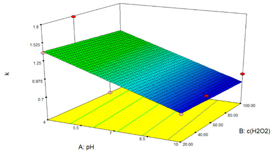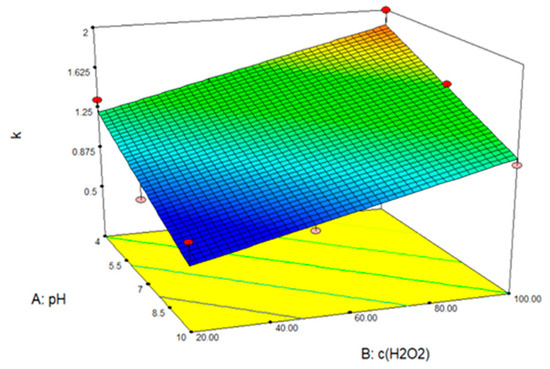 The multifactorial design of the pesticide removal experiment is shown in Table 2. To obtain the surface response, a multi-factor plan with three levels was used, consisting of two factors and three levels for each factor. The two factors that make up this plan are the pH value and hydrogen peroxide concentration. By reading the slope of the direction obtained, the search k values were determined, which are shown in Table 3.
