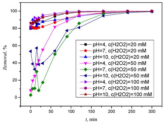 The calculated k values are in Table 4. From Figure 11 and Table 4, it can be concluded that the removal of CLO depends on both the hydrogen peroxide concentration and the pH value of the solution. It can be seen from Table 4 that the k values assume higher values in the acidic pH range, and in relation to the H2O2 concentration, the highest k values were obtained at 100 mM. From the comparison of Table 3 and Table 4, it is evident that CLO assumes significantly higher values, which is probably due to the contribution of photolytic degradation as the main degradation pathway, which is not present in ACE. From Figure 11, it can be concluded that the CLO removal process is favored by the higher hydrogen peroxide concentration and the lower pH value of the solution. It is also important to emphasize that CLO was removed from all solutions after five hours, regardless of the pH value and H2O2 concentration.