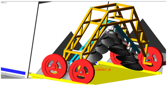 The glass greenhouse cleaner in this research has a total length of 4200 mm and a left–right symmetrical structure with five disc brushes arranged on each side (the diameter of a single brush is 600 mm). On each side, there is a motor controlling the rotation of the wheel of the cleaner, a motor controlling the rotation of the disc brushes, and two pusher motors controlling the lifting and lowering of the brushes. The five disc brushes are connected by means of gears, shafts, and telescopic cardanic couplings. The purpose of the lifting mechanism of the cleaner is twofold: (1) when the cleaner walks to the skylight which is higher than the roof surface, it can raise the brushes to avoid collision; (2) to ensure positive pressure between the brushes and the glass surface for optimal cleaning. An overall schematic of the cleaner is shown in Figure 1.