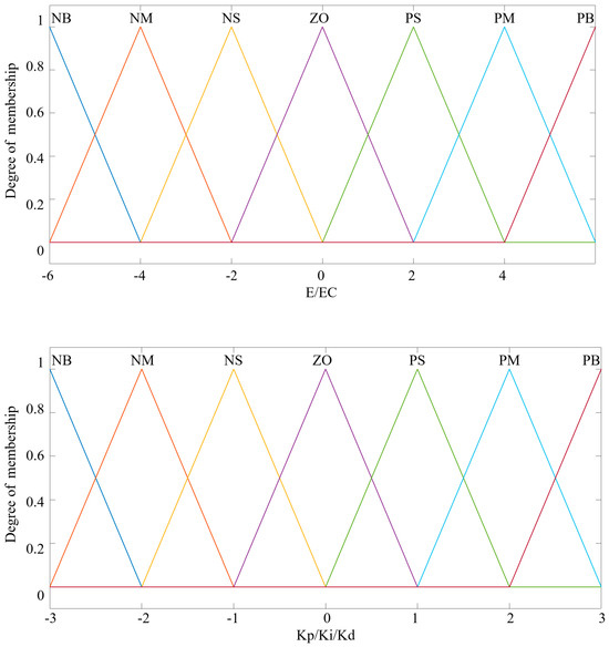 The seven levels of variable values are set as “NB, NM, NS, ZO, PS, PM, PB”, the domain corresponding to the input difference E and the rate of change of the difference EC is [−6, 6], and the domain corresponding to the outputs Kp, Ki, Kd is [−3, 3]. Each variable adopts the triangular state relationship function, whose corresponding function curves are shown in Figure 5. A fuzzy rule table is established empirically, as shown in Table 2.