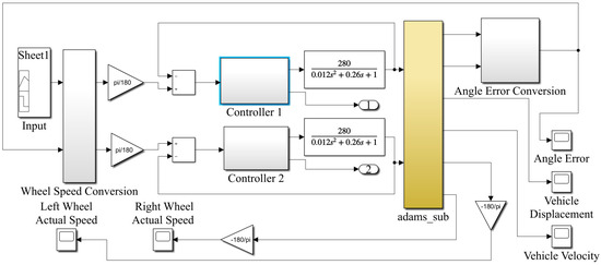 The angular error calculation module is responsible for taking the absolute value of the difference in angle between the washer axis and the greenhouse axis as output by Adams and combining it with the axis orientation to input the real-time angular error value into the wheel speed conversion module.