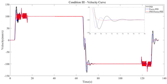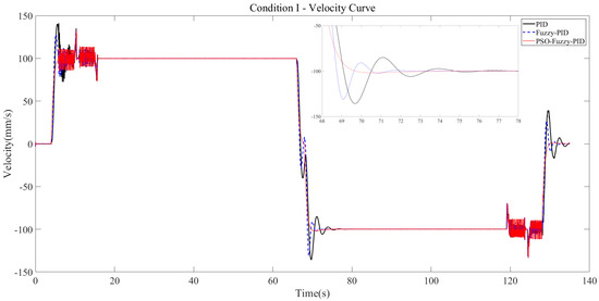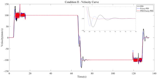 According to the velocity curve, the curve overshoot under the PID controller is 37.5%, and the response time is 11 s. Under the fuzzy PID controller, the curve overshoot is 31.1% and the response time is 8 s. Compared with the traditional PID controller, the overshoot is reduced by 6.4% and the response time is reduced by 3 s. Under the PSO fuzzy PID controller, the curve overshoot is 2% and the response time is 8 s. Compared with the traditional PID controller, the overshoot is reduced by 35.5% and the response time is reduced by 3 s.