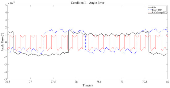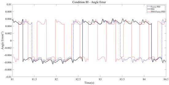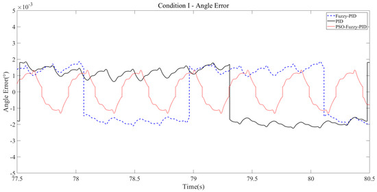 According to the angle error curve, the maximum absolute error of the PID controller is 1.844 × 10−3 deg, and the adjustment period is 2.96 s. Under the fuzzy PID controller, the maximum absolute error is 1.844 × 10−3 deg, and the adjustment cycle is 2.04 s. Compared with the traditional PID controller, the maximum absolute error is not reduced, but the adjustment cycle is shortened by 0.92 s. Under the PSO fuzzy PID controller, the maximum absolute error is 1.324 × 10−3 deg, and the adjustment period is 0.22 s. Compared with the traditional PID controller, the maximum absolute error is reduced by 0.52 × 10−3 deg, and the adjustment period is shortened by 2.74 s. It can be seen from the angle error curve that the PID controller and fuzzy PID controller both have angle abrupt phenomena in the control process, while the PSO fuzzy PID controller has almost no abrupt phenomenon, so the machine runs more stably.
