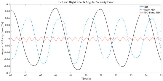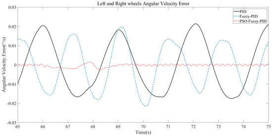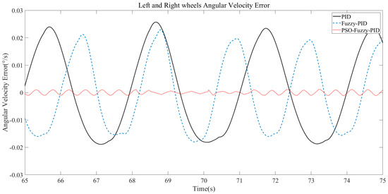 According to the wheel speed error curve, the maximum speed error under the PID controller is 0.023°/s, the maximum speed error under the fuzzy PID controller is 0.02°/s, and the maximum speed error under the PSO fuzzy PID controller is 0.003°/s. With the PSO fuzzy PID controller, the error of wheel speed on both sides of the machine is the lowest, and the machine runs stably.