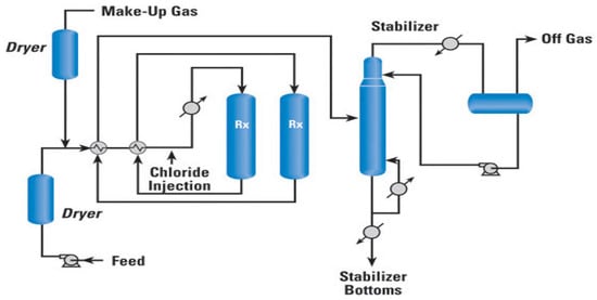 A once-through isomerization process is more affordable since there is no longer a need for a recycling gas compressor in the isomerization process. This process requires adding chloride continuously to maintain the catalyst’s activity, necessitating the use of a caustic scrubber to neutralize the acidity of the off-gases and prevent corrosion. Additionally, a make-up gas drier is required to remove moisture and extend the catalyst’s lifespan.