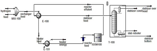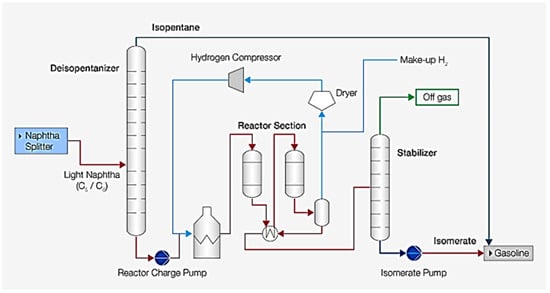 In this process, the feed stream enters a de-isopentanizer, in which i-C5 is separated overhead and sent to the gasoline blending pool. I-C5 is already an isomer, so its removal would only lower the unit’s capacity. The bottoms of the de-isopentanizer containing n-C5 and C6′s are dried and hydrogenated and passed through the reactor to isomerize the hydrocarbons. After separating hydrogen reactor effluent, it enters a stabilizer where the propane and lighter hydrocarbons are removed to be used as fuel gases. The bottom product is sent to the blending pool, as shown in Figure 3. This process has many advantages such as reducing throughput and increasing the driving force for isomerization. It produces isomerate with a high-octane number as it increases the conversion level of n-pentanes, while lowering reactor duty and space velocity. It is reasonable when the isopentane’s content in the feed is more than 13% [8,16].
