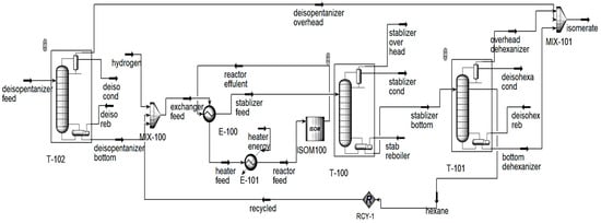 In this proposed case, both fractionators (de-isopentanizer and a de-hexanizer) are introduced to the base case study. The flow diagram of the process was not found in the literature survey, but the configuration of the process will be illustrated in Figure 4, which shows the simulated proposed configuration. The feed stream enters a de-isopentanizer, in which i-C5 is separated overhead and sent to the gasoline blending pool to lower the unit’s capacity. The bottoms of the de-isopentanizer, containing n-C5 and C6′s, are dried for maximum catalyst activity. The bottoms are then hydrogenated and passed through the reactor to isomerize the hydrocarbons. After separating hydrogen reactor effluent, it enters a stabilizer to boost conversion levels. The stabilized isomerate undergoes fractionation to maximize the octane number of the isomerate using de-hexanizer in which unconverted hexanes and low-octane products are separated from products. They are then recycled to be mixed with reactor feed to improve product octane number. This method is applied to feed containing significant amounts of isopentane. Less normal pentane would isomerize because of the equilibrium reaction, as overall concentration would be constrained by the iso-pentane in the feed. The equilibrium is pushed forward and more of the normal pentanes can isomerize when isopentane is removed from the feed. In this unit, the de-hexanizer is employed, and normal C5 and C6 are recycled to the reactor, resulting in greater octane of the produced fuel [8,16].