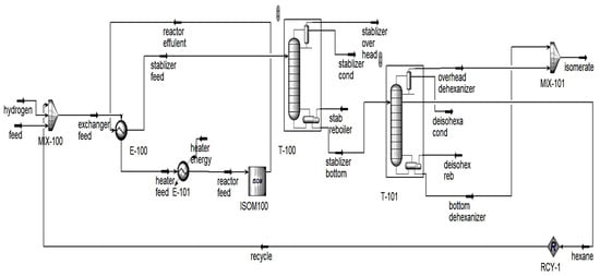The process presented in this research work is an isomerization unit of an Egyptian plant located in Alexandria, in which the octane number is upgraded from 66 to 82 in a penex process using a chlorinated alumina-based catalyst. In that process, low-octane components such as n-hexane and methyl pentane are recycled to the reactor, as shown in Figure 1, to increase octane number (isomerization with de-hexanizer) [18]. Naphtha feed comes from an atmospheric distillation unit, and from cracking units as hydrocracker and coker units. In this isomerization unit, naphtha and make-up hydrogen are first passed through driers to remove any traces of water to avoid poisoning of the Penex catalyst. After that, naphtha and hydrogen are mixed and then heated by exchanging heat with the first and second reactor effluents. Chlorine is injected into the reactor charge to provide acid sites on the catalyst’s surface that are necessary for the isomerization reaction. The feed reached the reaction temperature by a fired heater. The effluent of the first reactor is then cooled using exchangers before entering the second reactor to remove the generated heat from exothermic reactions in the first reactor bed. The reactor’s effluent is then fed to a stabilizer to separate light gases (C4− and hydrogen) from the product. The overhead gases are neutralized, and LPG is produced. The stabilized isomerate undergoes fractionation to maximize its octane number using a de-hexanizer, in which unconverted hexanes and low-octane products are separated from products. They are recycled to be mixed with fresh feed to improve product octane number. This Base Case has the lowest cost of the recycle flow schemes and supplies a high octane isomerate product; this scheme allows increasing hexane conversion but does not raise the content of isopentanes in the product. So, higher octane could be achieved by adding other fractionators [16].