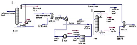 In this case, de-isopentanizer is used ahead of the reactor to separate isopentane from the input stream, as illustrated in Figure 7; the simulation results of the considered process are listed in Table 5.