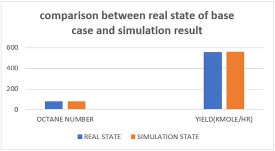 The results of the simulated base case of isomerization unit were validated with the data extracted from an industrial case of isomerization unit at an Egyptian refinery plant located in Alexandria. A comparison between the real state of the base case and simulation results is shown in Figure 8; it confirms that there is a good agreement between the actual and simulated results. Therefore, the base case simulation model can be used to evaluate the performance of the proposed configurations. It is worth mentioning that a similar result was reported by Yu. N. Lebedev who proved that Kedr-89 Co. has revamped several existing isomerization units by adding a DIH tower and an increase in the RON of commercial isomerate has been achieved. The experience of Kedr-89 Co. showed also that fitting isomerization units with a DIH tower increases the RON of commercial isomerate by a minimum of 4–5 points, which nearly almost agrees with the base case result [15].