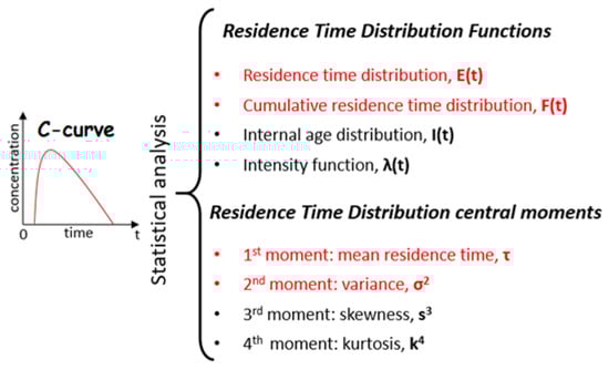 Four functions and four central moments can be used for calculating residence-time distributions (Figure 5). However, only two functions and two central moments (red in Figure 5) are commonly used for simple flow diagnosis.