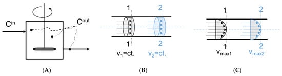 There are two distinct ideal flow models (Figure 6) that serve as benchmarks for fluid flow modeling: the plug flow (piston flow) and perfectly mixed flow (complete mixing) [10,44]. Each model is founded on a unique set of assumptions.