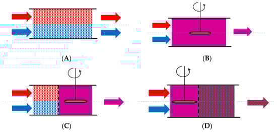 Another aspect that relates to the fluid flow and mixing models is the timing of mixing (the earliness or lateness of the mixing). A single stream’s fluid elements may mix as they enter the system or later as they pass through it. The timing of mixing is crucial for systems with multiple streams (such as two reactant streams entering a chemical reactor). Gorzalski et al. [65] proposed a suggestive visual representation of earliness and lateness of mixing for a two-stream system (Figure 8).