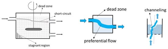 In real systems (non-ideal flow), the fluid may have complex flow patterns or exhibit mixing that is not uniform or predictable [66]. Compared to ideal models, the fluids behave differently for many reasons (such as the vessel’s geometry, the type, size, location of the inlet and outlet pipes, the mixer type, the fluids’ properties, and the fluid flow rate). The mixing degree is also affected by non-ideal flow. Some of these deviations from ideality are particularly recognized and acknowledged, such as dead zones, stagnant regions, back-mixing, short-circuits (bypasses), and preferential flows (channeling) [66].