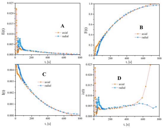 The internal age distribution measures the distribution of fluid elements ages inside the system, not on the system’s exit as the exit age distribution. I(t)∙dt represents the fraction of fluid elements within the system, with the age between t and t + dt (Figure S1). I(t) has the same [time−1] units as the E(t) function. There are some connections between the E(t), F(t), and I(t) functions, as shown in Equation (7).