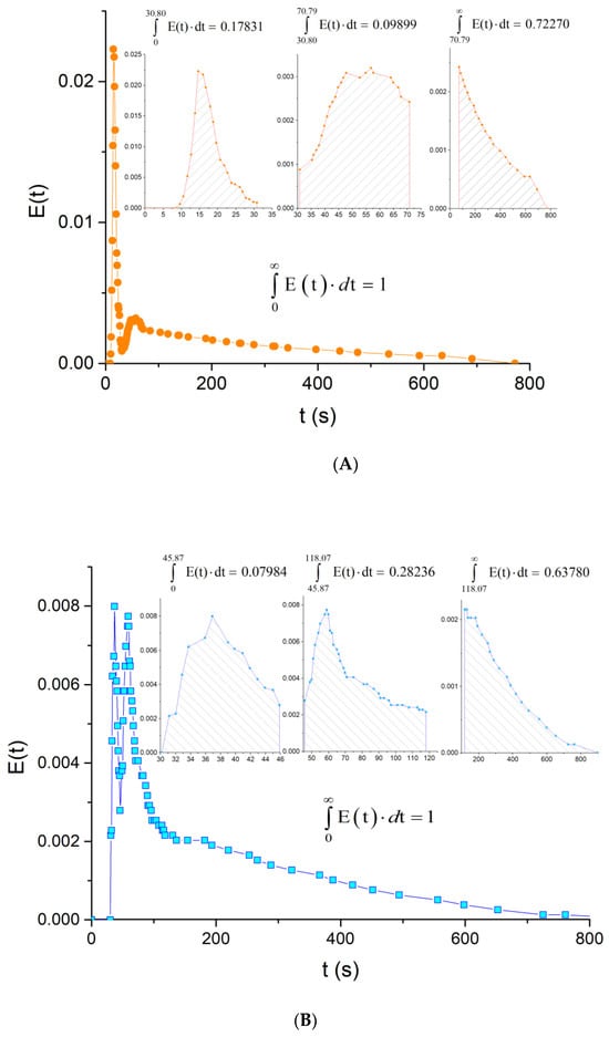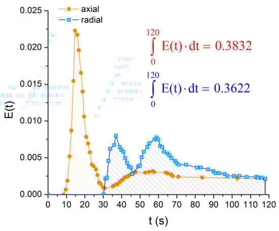 This function is known as “the residence time distribution” or “exit age distribution”. The exit age distribution considers that different fluid particles may experience different residence times within the system before exiting. It is a function of time, where E(t)∙dt represents the fraction of fluid elements leaving the system of age between t and t + dt (Figure S1), Equation (3). The units of E-curve are [time−1].