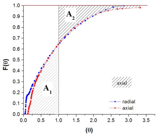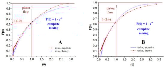 The fraction of fluid elements with a residence time less than t is defined as the cumulative residence time distribution function F(t). It is also the probability that a fluid element that entered at t = 0 has left the system at or by time t [60]. According to its definition, the equalities presented in Equation (4) are valid. The typical shape of the F-curve is presented in Figure S1.