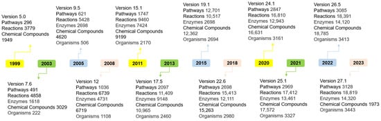 The MetaCyc database contains annotations of the metabolic pathways of different living organisms, which were also curated by analyzing sources in the literature []. Database development was initiated in the early 2000s by the Bioinformatics Research Group of the American Non-profit Research Institute (USA) (Figure 3).