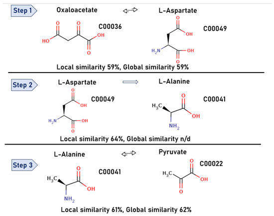 Breadth-first search (BFS) is a commonly used method for finding the shortest path (k) between two metabolites (Pathway Hunter) [,]. Finding the pathways k is performed using two biochemical criteria: the “local” and “global” structural similarities between metabolites. The “local similarity” is defined as similarity between two intermediate molecules, while “global similarity” is defined as similarity between the initial metabolite (the substrate) and the product after a series of biochemical transformations (Figure 8).