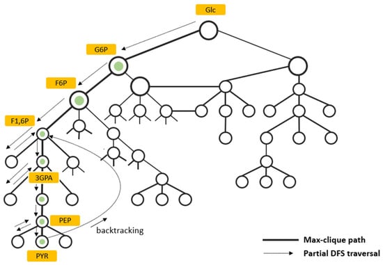 The depth-first search (DFS) method employs the procedure of finding elementary flux modes in metabolic networks (EFM), which are the minimal sets of reactions proceeding in the given direction [,]. The depth-first search strategy is implemented by indexing biochemical reactions for each EFM and detecting active and non-active free fluxes []. Alternation of the direct and reverse tracking programs allows one to detect and follow the descending active and non-active free fluxes (black arrows in Figure 9) and subsequently exclude the revealed non-active fluxes (MetQuest) [,].