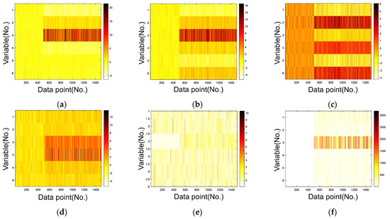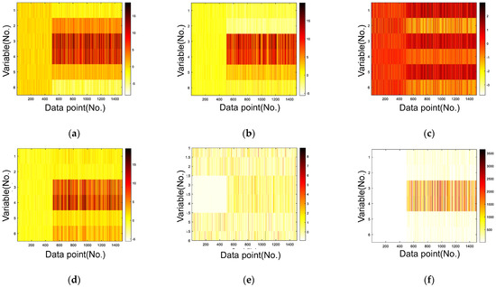 Carlos [15] proposed a simple numerical example to compare the diagnostic results when single or multiple faults of moderate sizes occur. As shown in Equation (6), this example is calculated using the simulation model. Zhou [18] used simulation data to compare the performances of the proposed model. This example consists of six variables that can be generated using the following system: