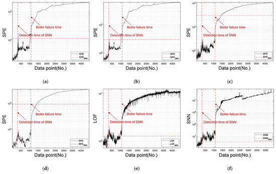 Comparison of the fault detection results: (a) PCA, (b) DPCA, (c) ICA, (d) DICA, (e) LOF, (f) SNN.