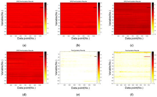 Comparison of the fault isolation results: (a) PCA, (b) DPCA, (c) ICA, (d) DICA, (e) LOF, (f) SNN.