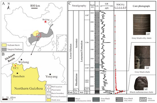 (A) Location of the study area (modified from [50]). (B) Location of the sampling YC1 well (modified from [50]). (C) Stratigraphic column, TOC, and core photographs of the Wufeng–Longmaxi Formation in YC1 well. Ord. = Ordovician, WF = Wufeng Formation, Kat. = Katian, Hir. = Hirnantian, Lith. = Lithology.